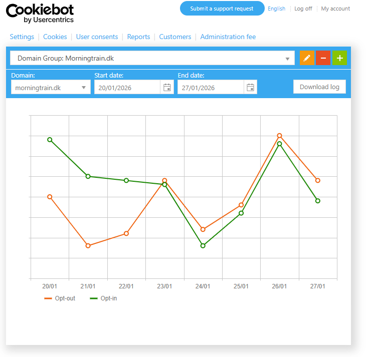Eksperimentet blev sat op med Cookiebot. Cookiebot har en log for hver brugerinteraktion med cookie-samtykket, som kan downloades fra deres website.