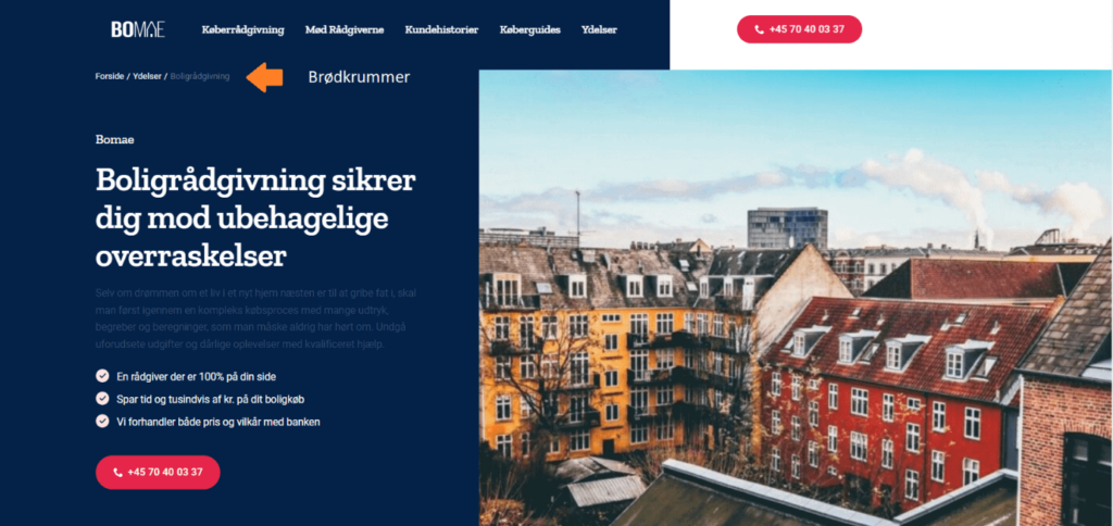 Du kan også implementere “brødkrummer” på websitet for at hjælpe den besøgende med at finde ud af, hvor på sitet de er, samt hvordan de nemt finder tilbage: