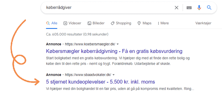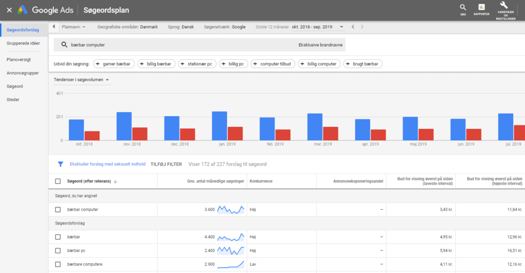 Ligeledes kan du undersøge, om der er annoncer på dem – altså om der er konkurrence om dine ønskede søgeord.