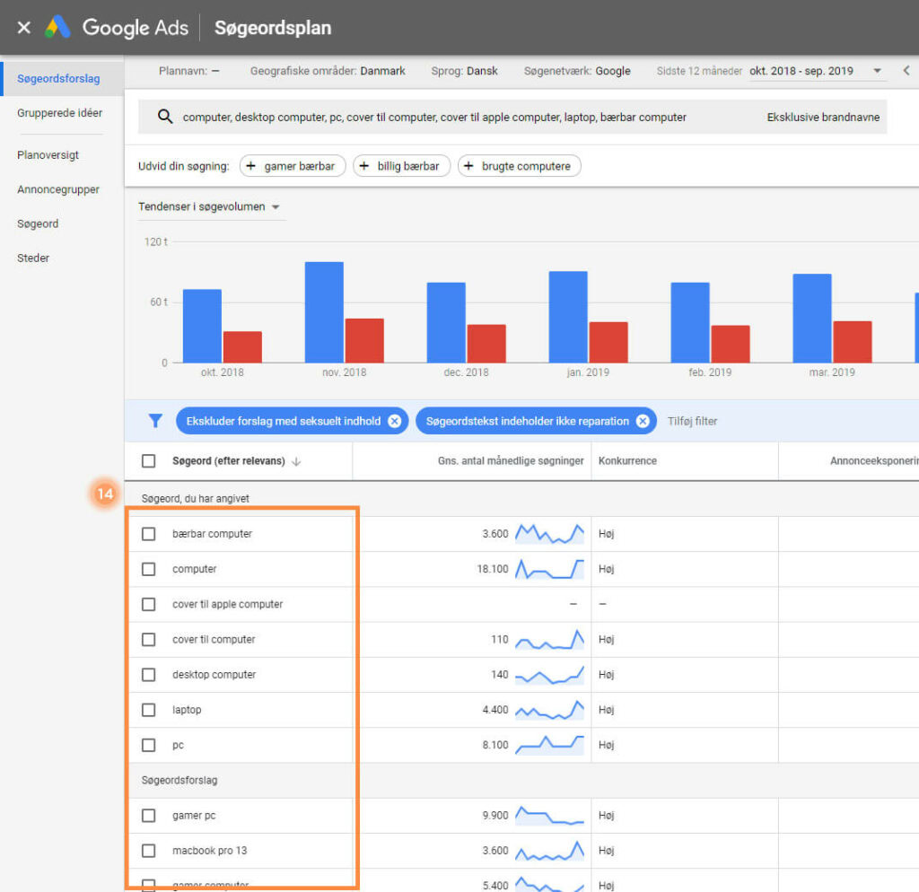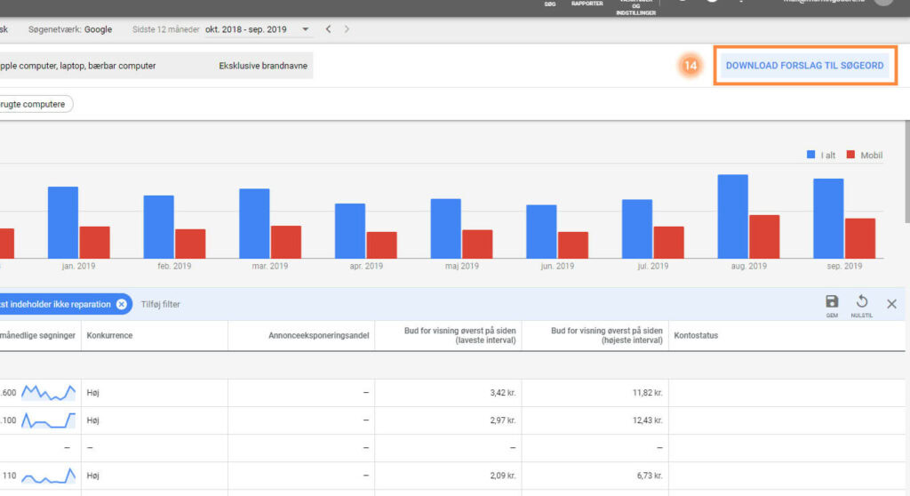 15. Du kan også eksportere alle dine søgeord til Excel, hvis du vil. Klik på ”DOWNLOAD FORSLAG TIL SØGEORD” i øvre højre hjørne.