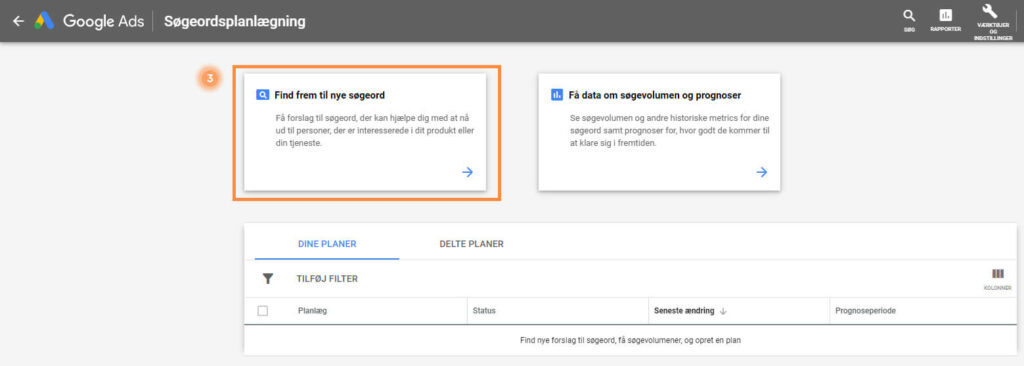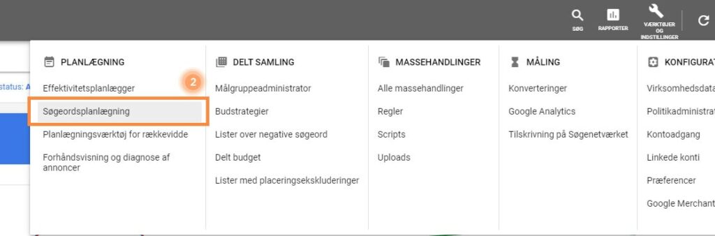 2. Klik på ”Søgeordsplanlægning” under ”PLANLÆGNING”.