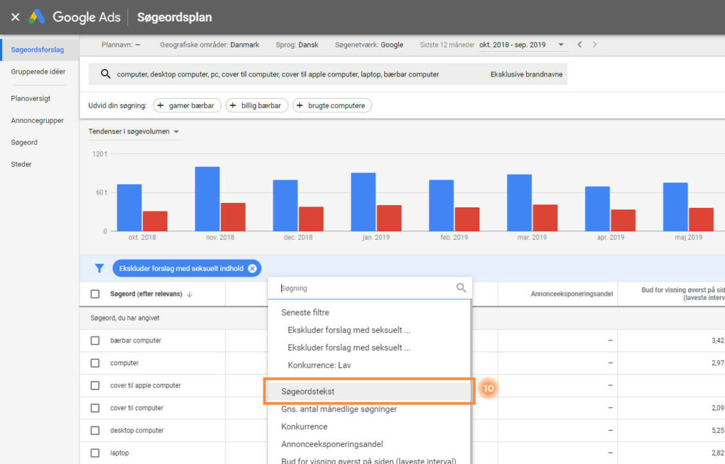 9. Hvis du har negative søgeord, er nu et godt tidspunkt at ekskludere dem. Klik på ”TILFØJ FILTER”. Du kan altid gøre dette senere hen i Excel, men for at holde orden i tingene, anbefaler vi, at du tilføjer filtrene direkte i Keyword Planner.