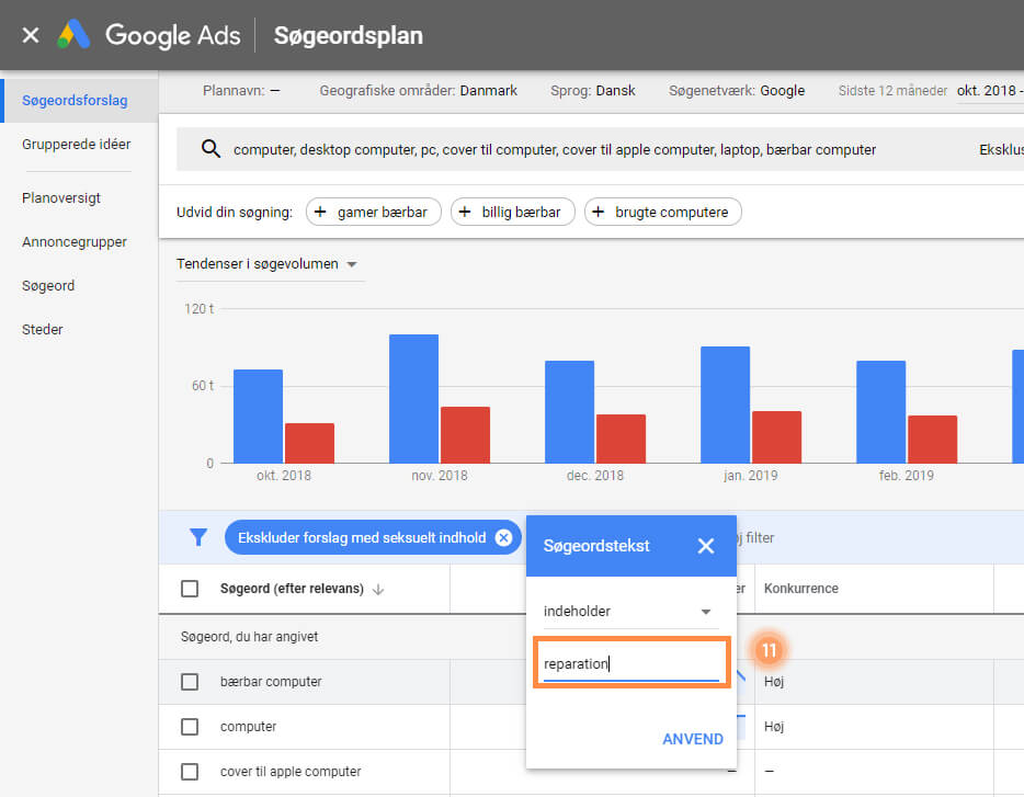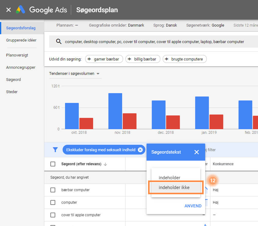 13. Klik på ”ANVEND” for at se de filtrerede søgeord.