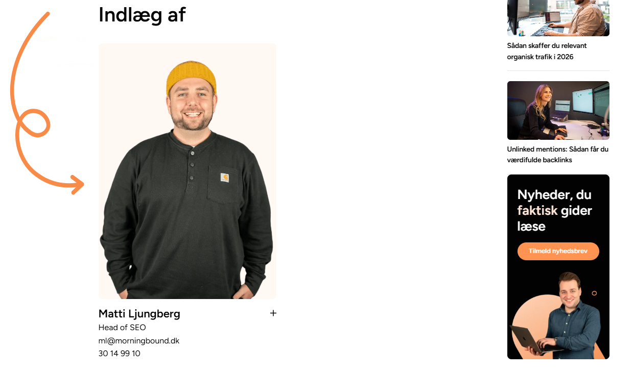 Google belønner gennemsigtighed. Gør det tydeligt, hvem der står bag indholdet – med navn, rolle og gerne faglig baggrund. Det gælder især på sider, hvor tillid og ekspertise er vigtige faktorer.