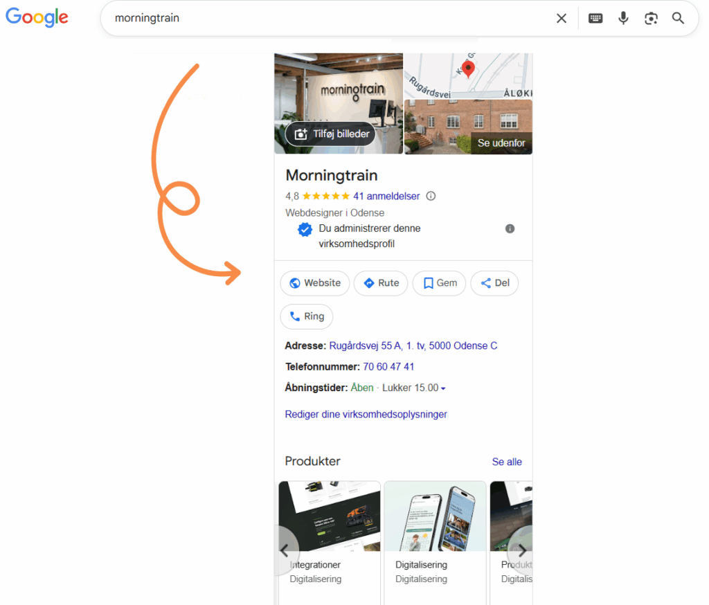 Google My Business er det første, dine potentielle kunder ser, når de søger på dit brandnavn. Så det er en del af din brand experience.