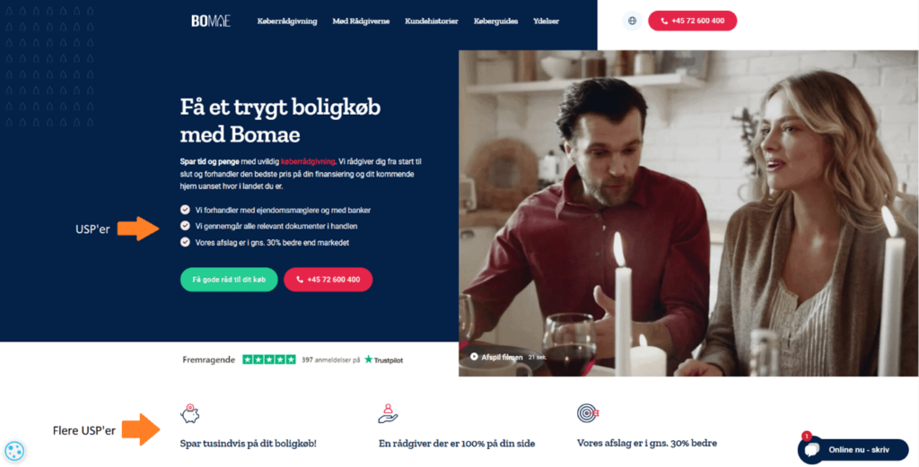 Du skal med andre ord formulere dig kort, præcist og på en måde der giver den besøgende et billede af værdien. Tal og procenter kan være effektive virkemidler i en USP, da de giver en kontekst/ramme, som brugeren kan forholde sig til.