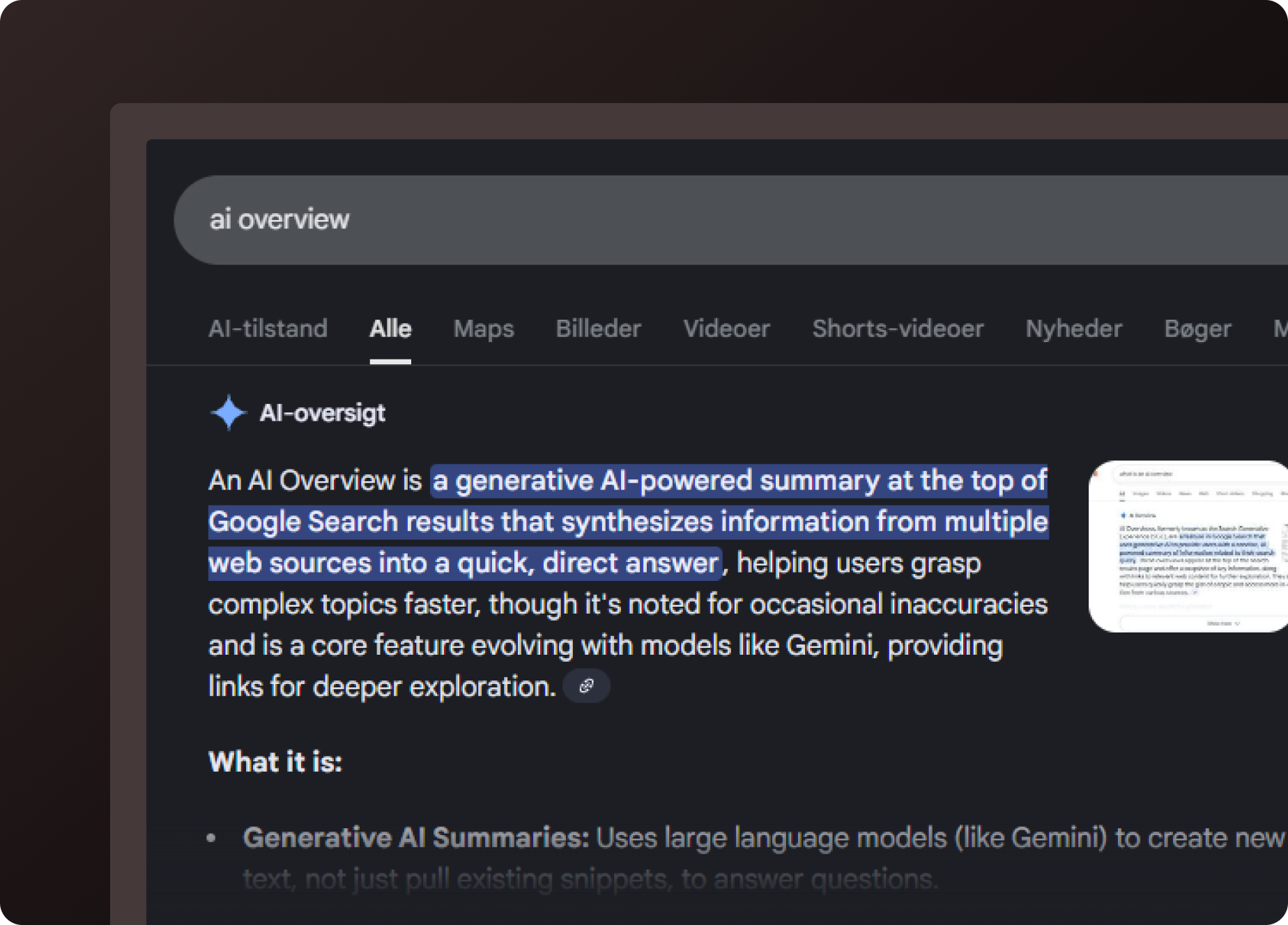 Læs denne artikel, hvis du vil vide mere om hvad Google AI Overviews er.