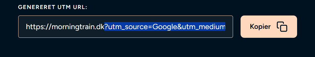 | Søgeord utm_term | Nej | “produktkonfigurator” | utm_term er kun relevant for Google og Microsoft Ads, hvor du kan se hvilket søgeord, trafikken kom fra. |